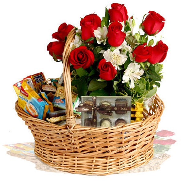 Uma bela cesta de vime com um arranjo de rosas vermelhas e alstroemérias ou de flores do campo, com uma caixa de bombons Ferrero Rocher 186 g (15 bombons) e com produtos para um delicioso café da manhã: 1 suco de frutas 200 ml, 1 achocolatado 200 ml, 2 sucrilhos Kellog´s, 1 bolinho Bauducco, 2 torradas Bauducco, 2 biscoitos maizena Bauducco, 2 biscoitos banana e canela Bauducco, 2 biscoitos chocolate Bauducco, 2 biscoitos leite Bauducco, 2 biscoitos levissimo Bauducco, 1 creamy cookie Bauducco, 2 Club Social, 2 biscoitos chocolate Parati, 1 maxi goiabinha Bauducco, 1 mentinha, 1 pão de mel, 1 geléia, 1 nucita, 1 sachet café com leite, 2 sachets capuccino, 1 sachet café solúvel, 2 sachets de chá, 4 sachets de açucar, 2 bombons, 1 jogo de talheres plásticos.